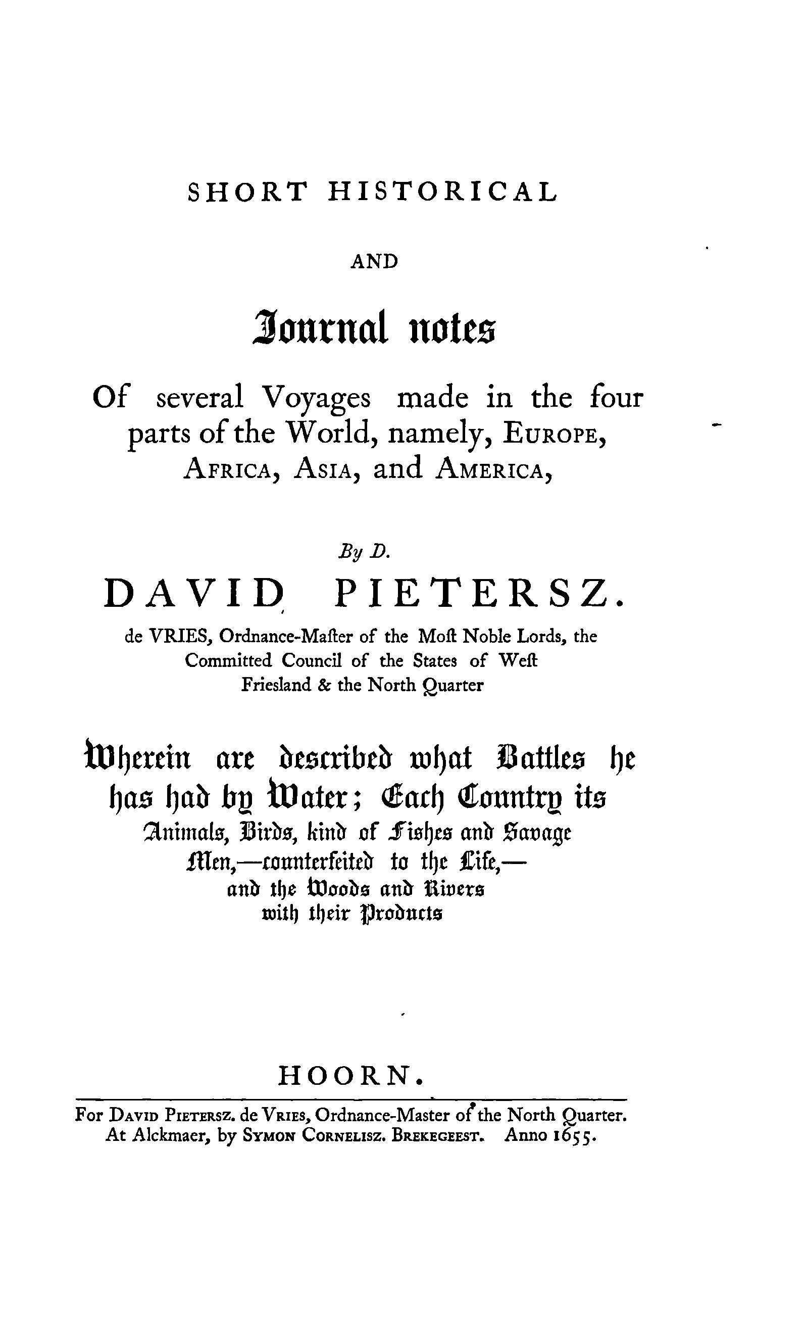Courtesy of the Library of Congress. Citation: Vries, David Pietersz. De, Active, and Henry Cruse Murphy. Voyages from Holland to America, A.D.to 1644. New-York, 1857... [Pdf]. Retrieved from the Library of Congress, <https://www.loc.gov/item/11021759/;.